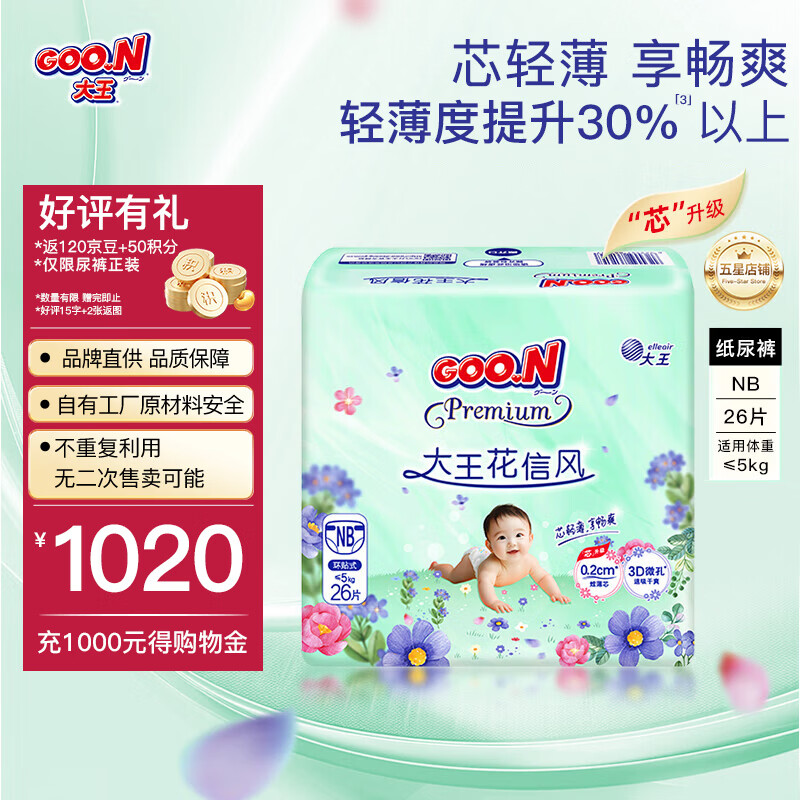 大王(GOO.N)【品牌直供 安心品质】花信风纸尿裤夏日清爽透气尿不湿尿不湿 【芯升级】纸尿裤NB26片 (小于5KG)