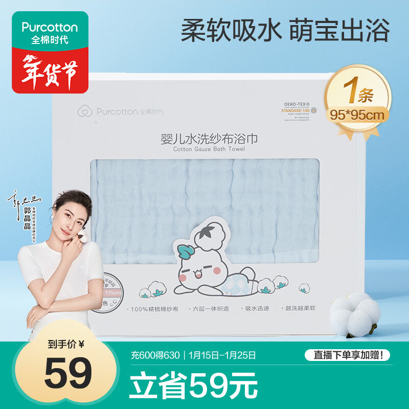 自营全棉时代婴儿浴巾6层水洗纱布浴巾 宝宝纯棉毛巾礼盒 蓝色95*95cm