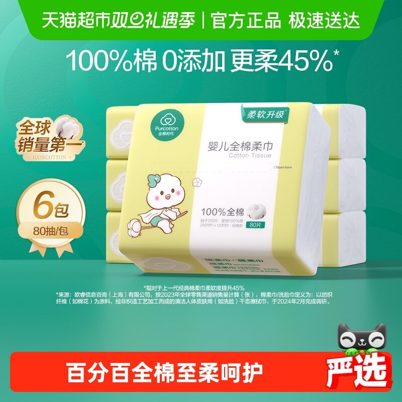 自营全棉时代【孙颖莎同款】婴儿棉柔巾100%纯棉干湿两用洗脸巾100抽*6包