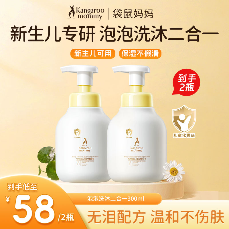 旗舰店【0岁+新生儿专研洗沐二合一】袋鼠妈妈儿童洗发润肤婴幼儿泡泡洗沐