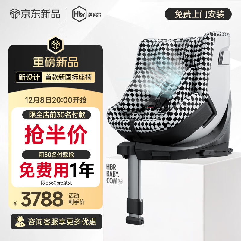 自营虎贝尔(HBR)E360pro新国标儿童安全座椅汽车用0-12岁i-Size黑白格智能循风