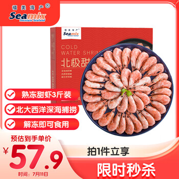 自营禧美海产 熟冻北极甜虾净重3斤装/盒 150/180规格 冰虾 MSC认证 海鲜水产