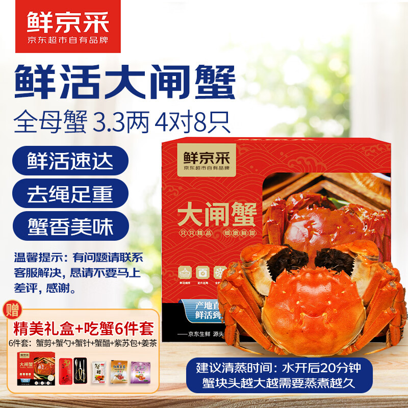自营【活蟹】鲜京采鲜活大闸蟹 全母蟹3.3两 4对8只 去绳足重 蟹类螃蟹礼盒源头直发