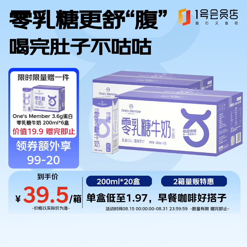 1号会员店(OM) 3.6g蛋白零乳糖牛奶 200ml*20盒 0乳糖 2箱