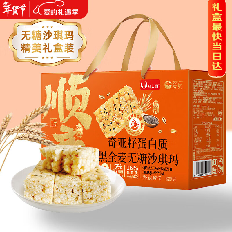 自营马大姐无糖沙琪玛礼盒1.08kg奇亚籽黑全麦新年春节送礼年货糕点礼盒