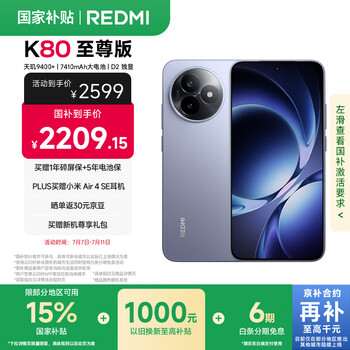 自营小米(MI)REDMI K80 至尊版 天玑9400+ 7410mAh大电池 冰锋蓝 12+256 红米5G手机 YU7 小米汽车