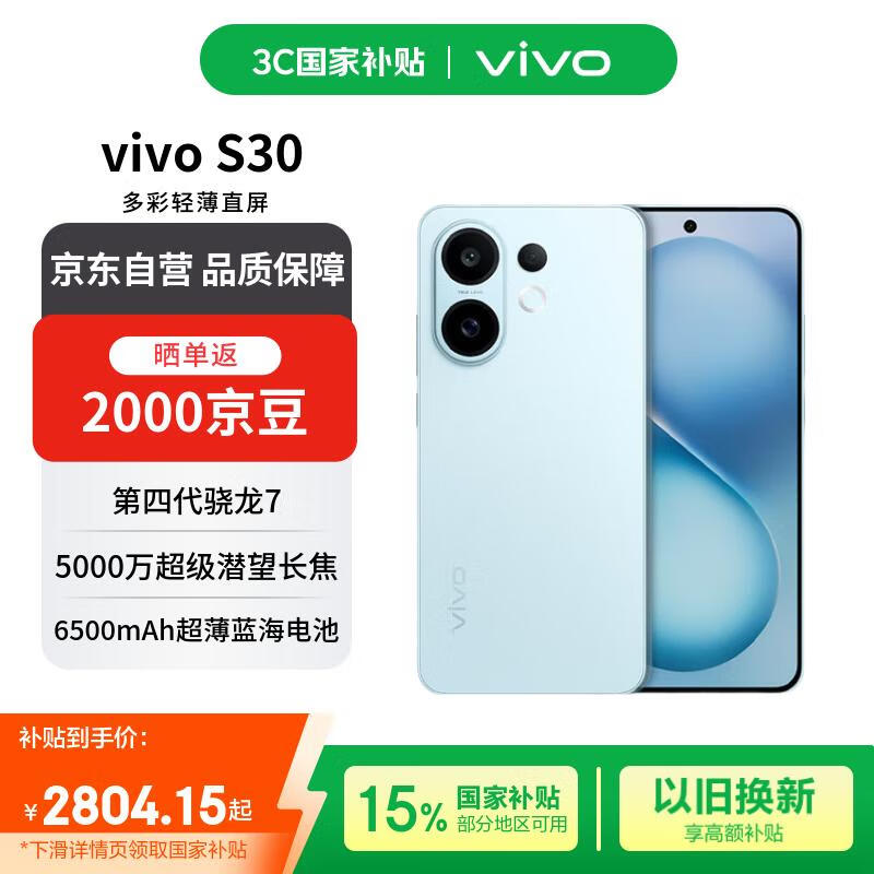 自营vivo S30 16+512 薄荷青 多彩轻薄直屏 超级潜望长焦 学生live图 AI手机【赠话费券】国家补贴
