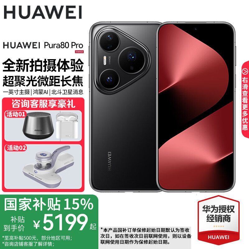旗舰店HUAWEI Pura 80 Pro 新品旗舰华为手机 p80pro 一英寸主摄拍照 个性色卡 AI辅助构图 华为鸿蒙智能手机 釉黑 12GB+256GB 官方标配