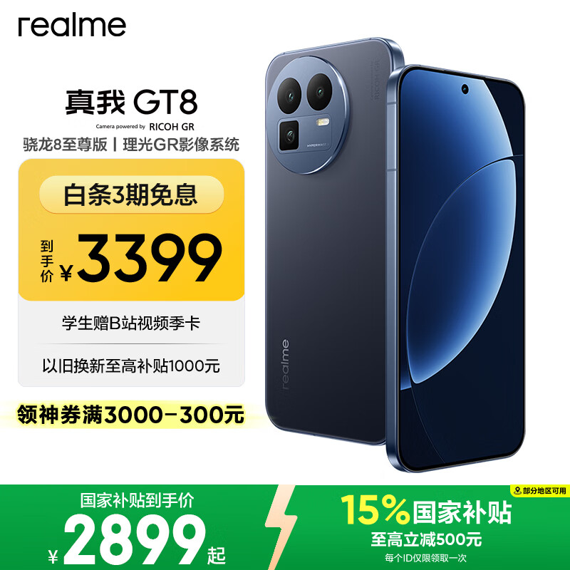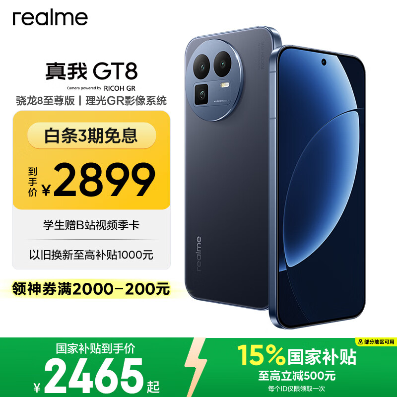 自营realme真我GT8 OPPO 骁龙8至尊版 2K 144Hz高刷直屏 5000万潜望长焦 电竞游戏学生手机京东自营12+512蓝