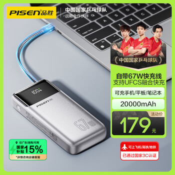 自营品胜【3C认证】充电宝带Type-C线67W快充20000毫安大容量可上飞机高铁移动电源适用苹果笔记本电脑65W