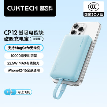 自营CUKTECH酷态科【3C认证可上飞机】CP12磁吸充电宝自带线MagSafe无线10000毫安22.5W快充适用苹果16/15小米