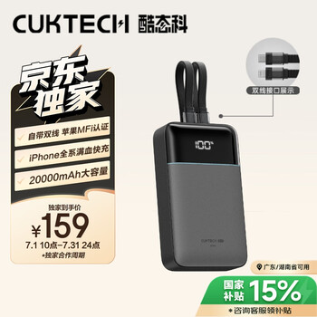自营CUKTECH酷态科【3C认证可上飞机】CP24电能块40W自带双线充电宝20000毫安大容量快充移动电源适用安卓苹果