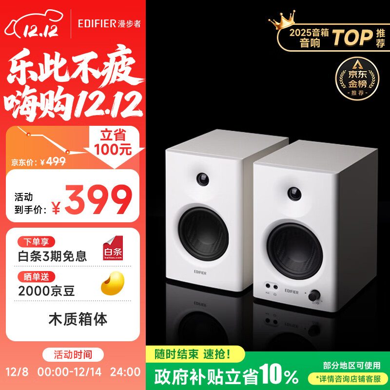 自营漫步者(EDIFIER)MR4 有源监听2.0音箱 高保真HIFI音质 多媒体电脑电视音响 桌面音响 白色 礼物