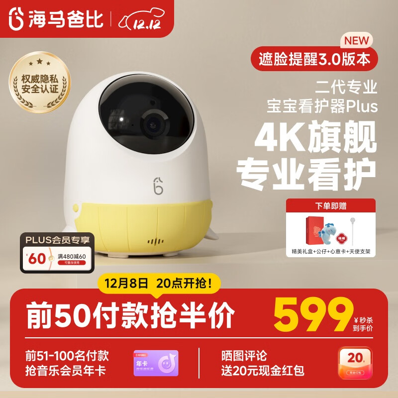 自营海马爸比婴儿看护器2PLUS智能监控哭声呼吸睡眠宝宝监视器儿童摄像头