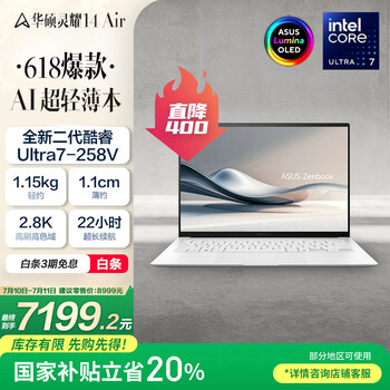 自营华硕灵耀14 Air国家补贴20%酷睿Ultra7 2.8K 120Hz OLED 1.1cm超轻薄22小时长续航AI电脑(258V 32G 1T)