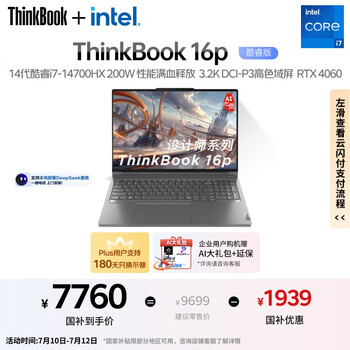 自营ThinkPad【国家补贴20%】联想AI元启ThinkBook设计师16p游戏创作本14代酷睿i7 16英寸16G 1T RTX4060 3.2K