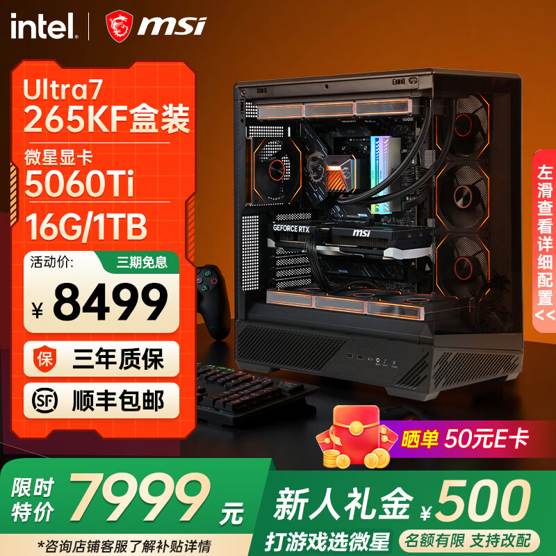 旗舰店微星(MSI)全家桶英特尔Ultra9 285k 265KF 5070Ti 5080显卡设计游戏台式电脑主机组装电脑Deepseek 酷睿U7 265KF+5060TI丨2K高端丨配三