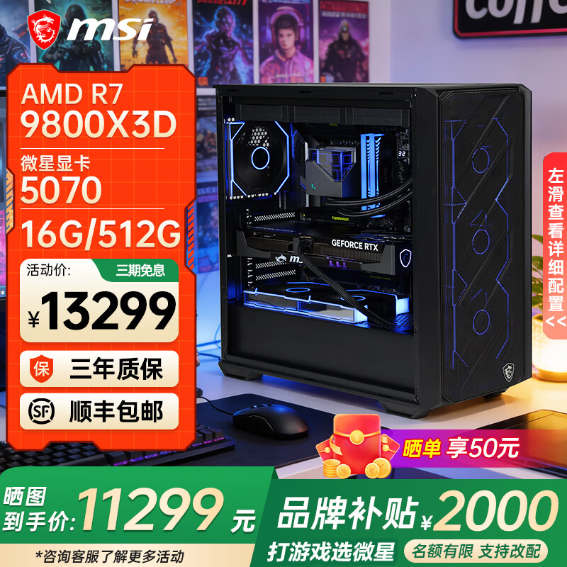 旗舰店微星AMD锐龙9850X3D 9800X3D 5070Ti 5080 5090D显卡直播台式DIY组装电脑主机游戏电竞办公设计整机 配置三丨R7 9800X3D+RTX5070