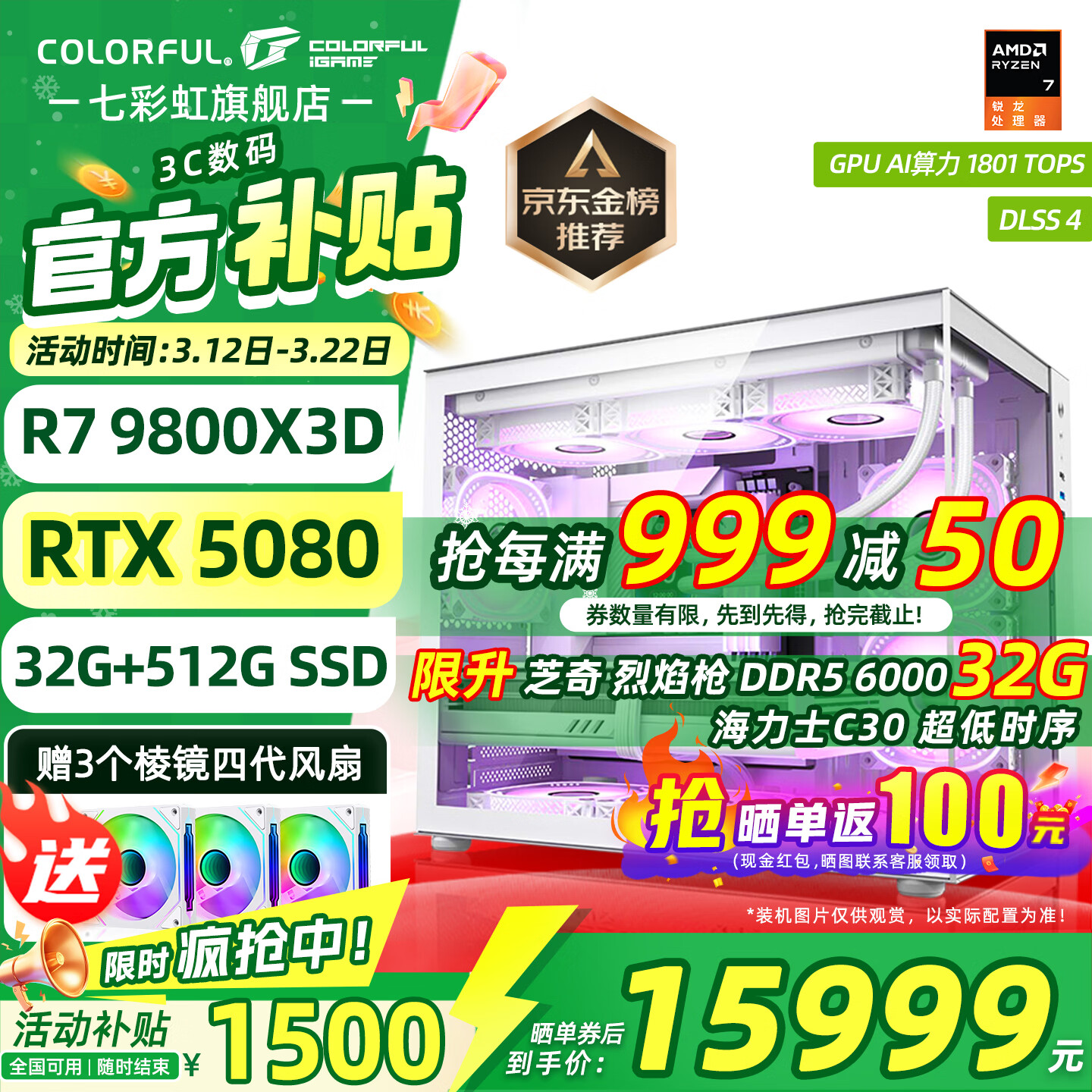 旗舰店七彩虹海景房主机AMD锐龙R7 9800x3d搭5080/5070TI 5060TI显卡 千帧电竞 游戏直播AI主机 组装电脑 配六:R7 9800X3D丨32G丨5080 稀缺货源 全新原装
