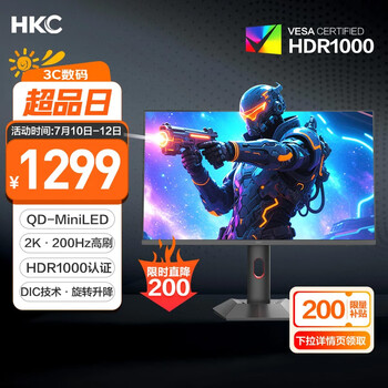 自营HKC 27英寸2K 200Hz电竞QD量子点MiniLED广色域HDR1000认证1ms响应10bit游戏旋转升降显示器G27M2Pro