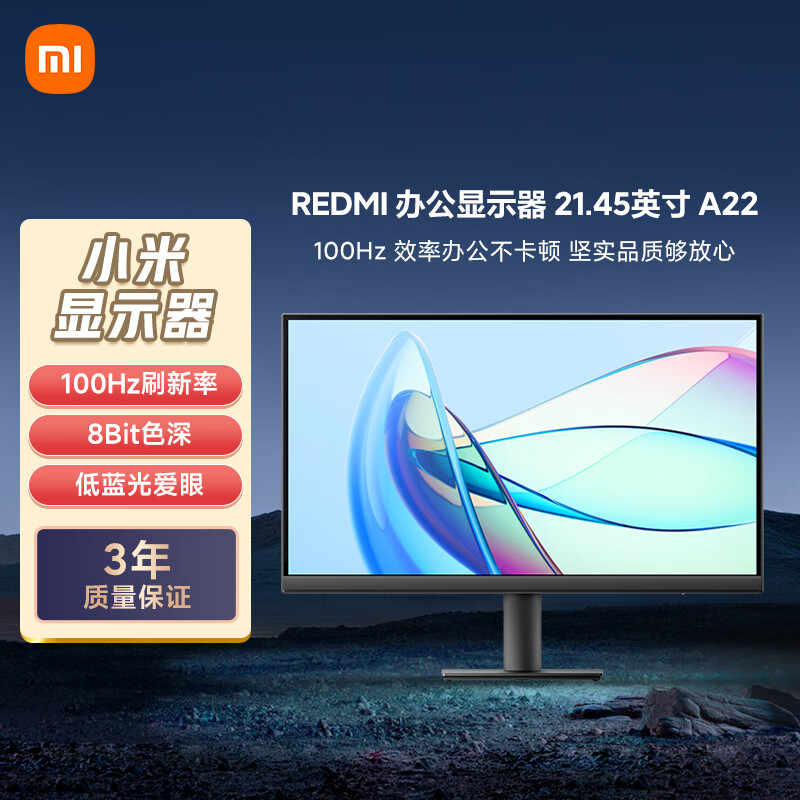 自营小米(MI)REDMI 21.45英寸显示器100Hz 8Bit色深 300nits亮度 全高清微边框低蓝光电脑办公显示器显示屏 A22