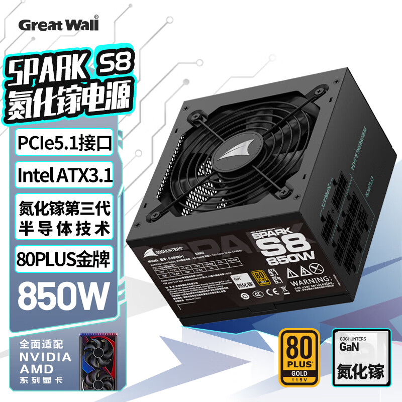 自营长城(Great Wall)氮化镓850W台式电脑电源金牌模组(ATX3.1/原生PCIe5.1/单路12V/自动启停/支持40系50系显卡)