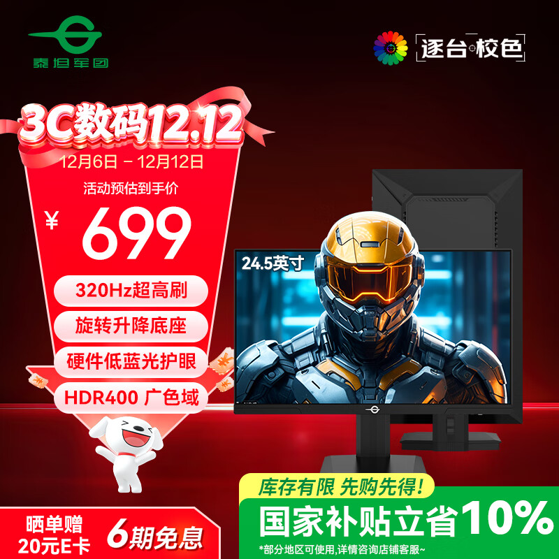 自营泰坦军团 24.5英寸 320Hz FastIPS快速液晶 HDR400硬件低蓝光 1ms 旋转升降300Hz电竞FPS显示器P2510H PRO+