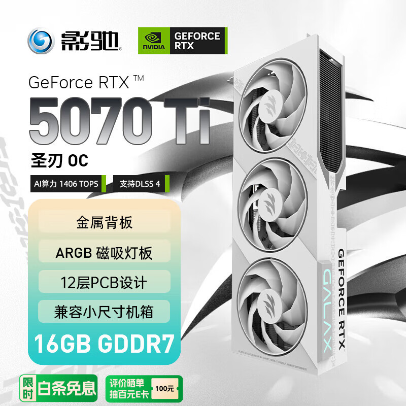 自营影驰 GeForce RTX 5070 Ti 金属大师 白金版 OC 16GB GDDR7 DLSS 4 电竞游戏设计剪辑AI电脑显卡