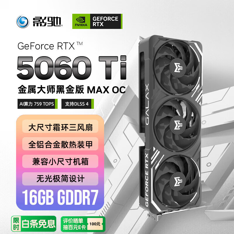 自营影驰 GeForce RTX 5060 Ti 金属大师 黑金版 MAX OC 16GB GDDR7 DLSS 4 电竞光追游戏/AI本地部署显卡