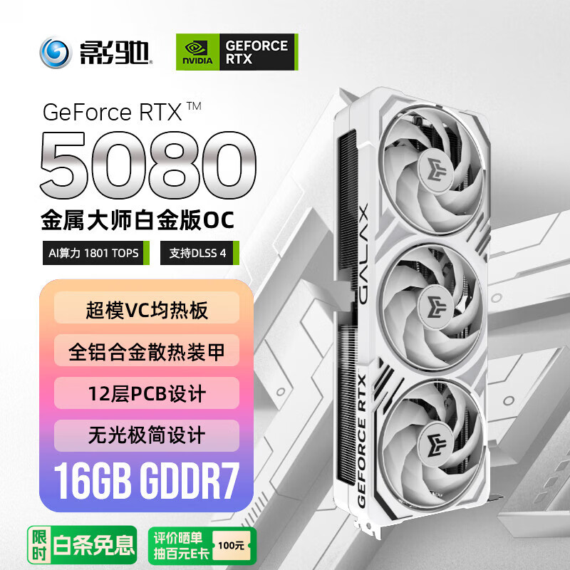 自营影驰 GeForce RTX 5080 金属大师 白金版 OC 16G GDDR7 DLSS 4 电竞游戏设计剪辑AI电脑显卡
