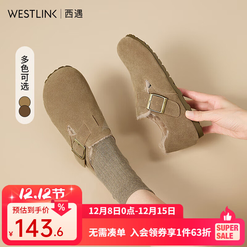 旗舰店西遇加绒勃肯鞋女冬季2025新款低帮一脚蹬保暖雪地靴毛毛厚底棉鞋 焦糖色 (预售30天) 37 (235)