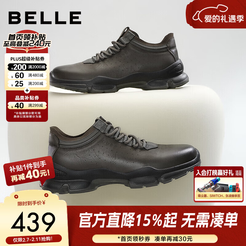 旗舰店百丽厚底增高健步鞋男25秋新抓纹牛皮户外休闲运动鞋A2215CM5预售 黑色 41 (255mm)