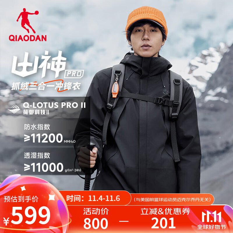 旗舰店乔丹QIAODAN三合一山神冲锋衣男外套风衣户外登山防风防泼水连帽夹克 黑色(含内胆) 175/L