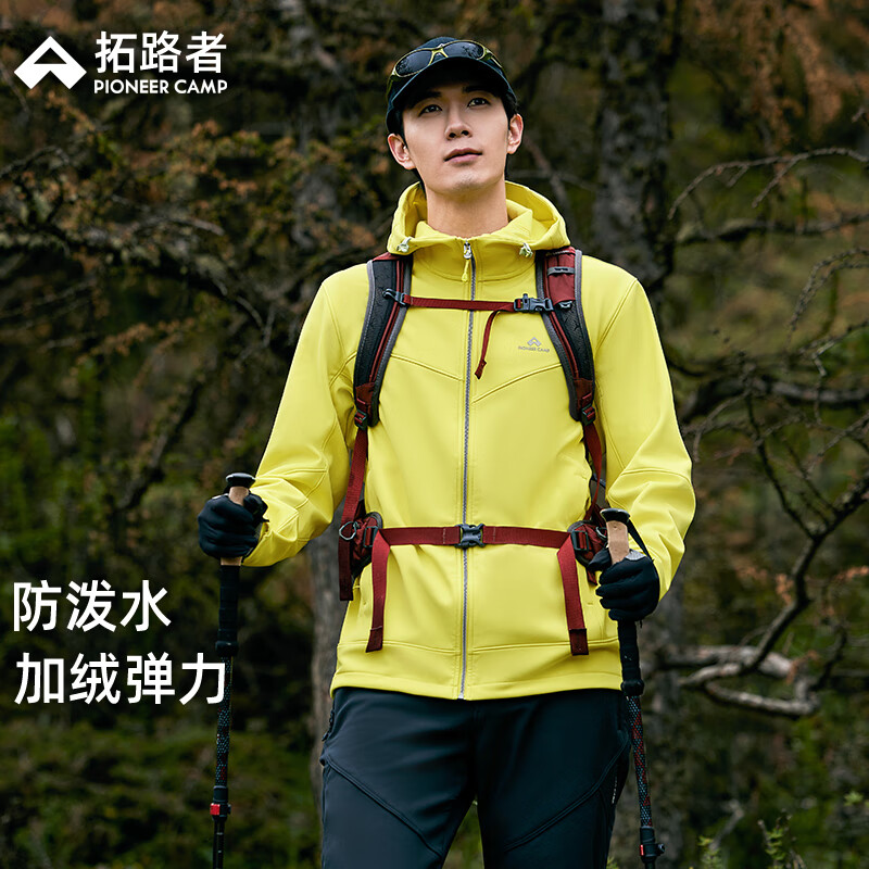 旗舰店拓路者海豹软壳衣加绒男户外登山服秋冬季保暖连帽夹克外套定制防水防风 亮黄色 无膜加绒 L