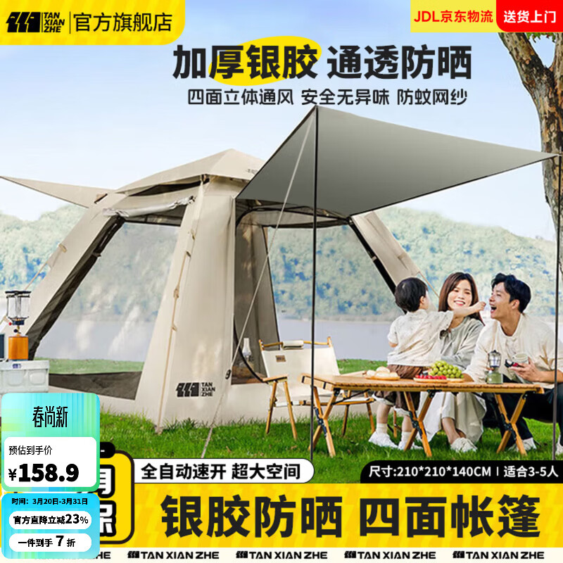 旗舰店探险者(TAN XIAN ZHE)帐篷户外露营防雨过夜3人-4人速开便捷天幕二合一黑胶防晒帐篷 3-5人加厚防晒帐篷【云雾白】