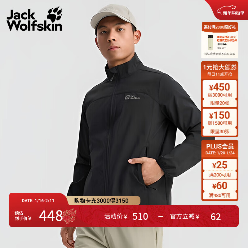旗舰店jackWolfskin狼爪秋冬新款MILFORD男士户外弹力防风小立领软壳夹克外套5324171 黑色/6000 XL