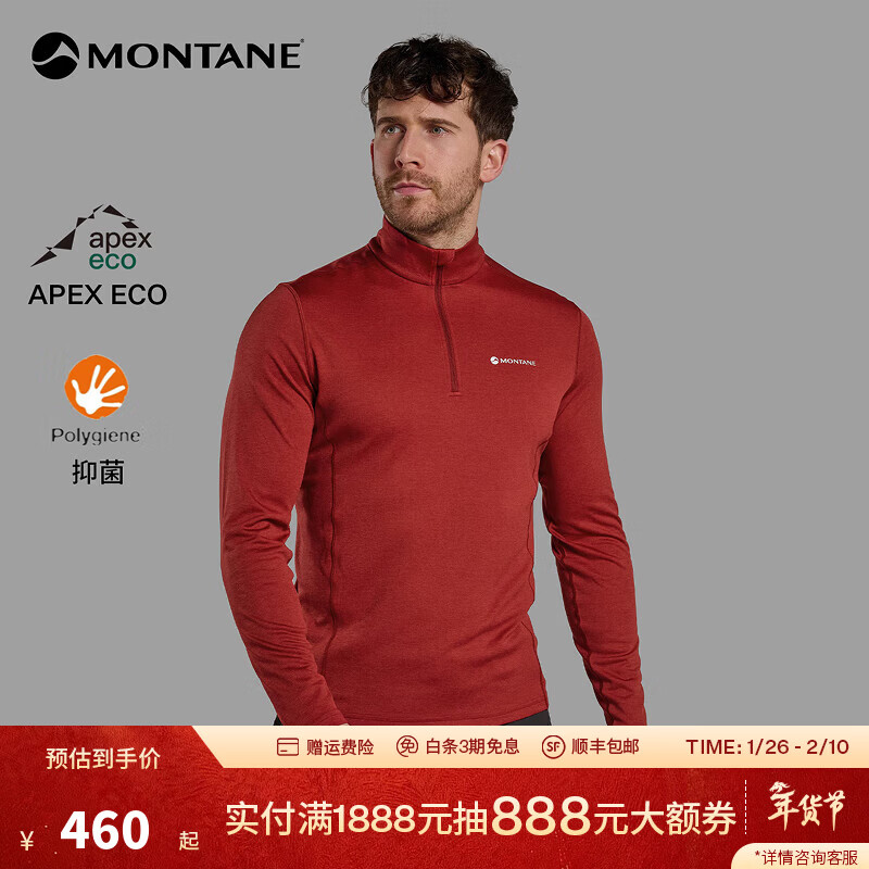 旗舰店MONTANE盟泰恩DART ZIP NECK户外速干衣男圆领透气抑菌登山徒步衫长袖 枫叶红 L