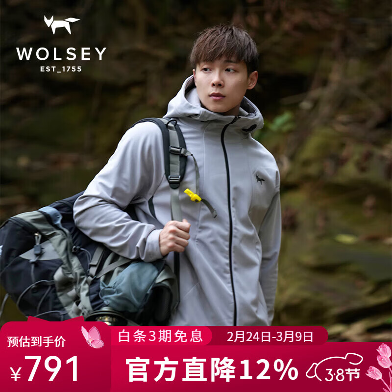 旗舰店WOLSEY户外软壳衣加绒保暖防风防水夹克外套加厚秋冬款男士登山服 银灰色 XL180