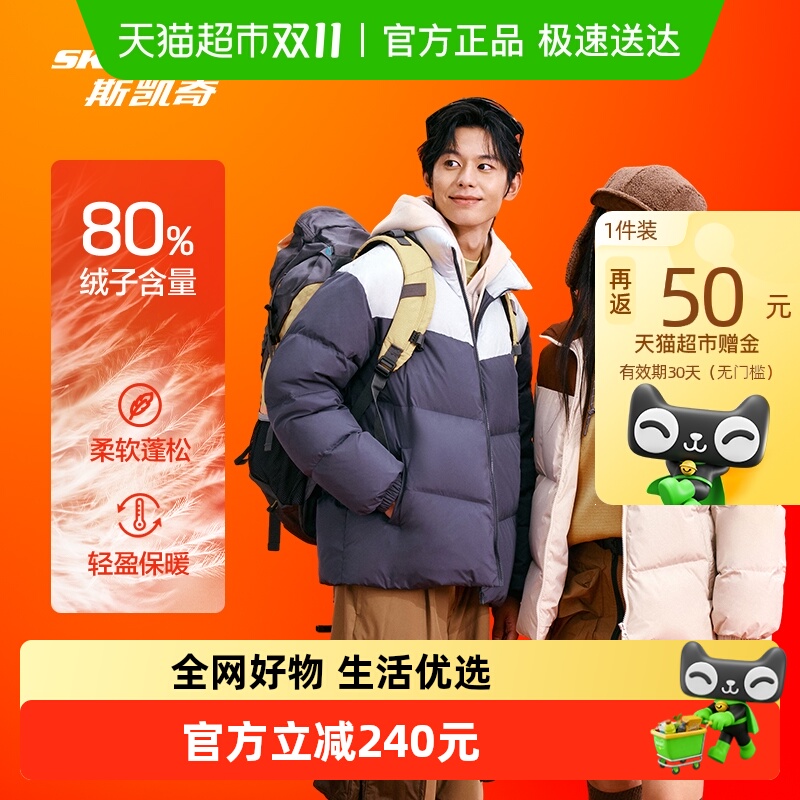 Skechers斯凯奇面包羽绒服冬季男女款拼色保暖防寒运动外套