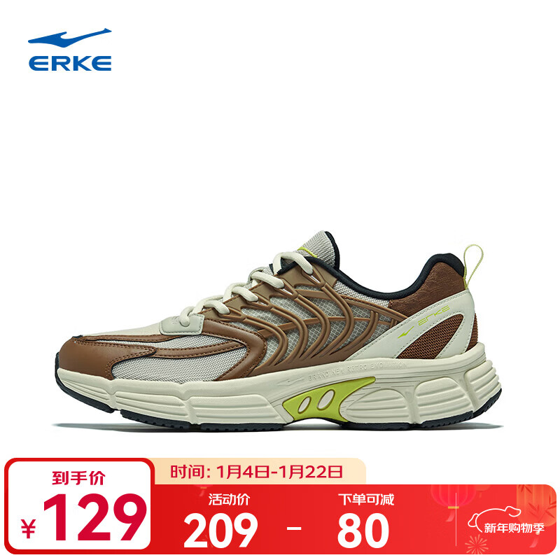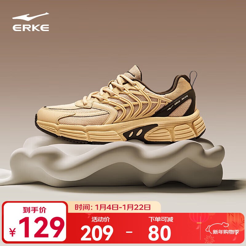 旗舰店鸿星尔克鱼刺男子休闲鞋秋季百搭简约老爹鞋厚底软弹运动鞋子舒适休闲男鞋 燕麦色/深檀色 42