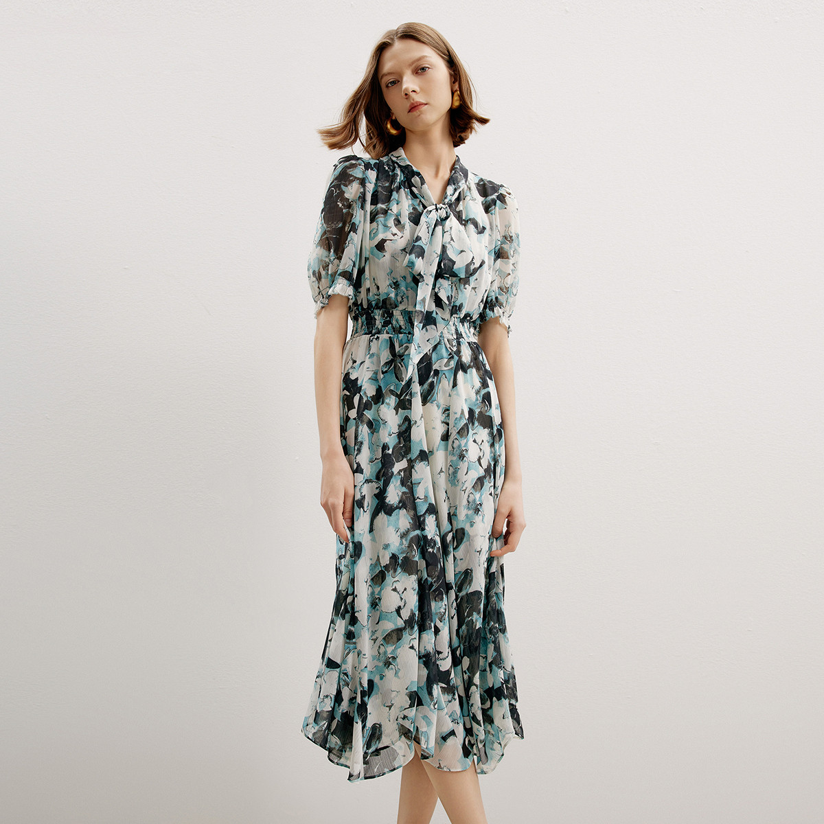 朗姿 法式设计感小众印花收腰泡泡袖春秋款气质高级感连衣裙