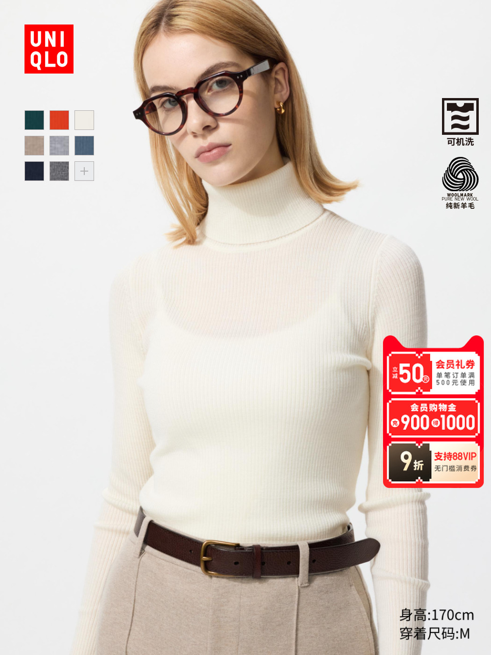 旗舰店优衣库女装精纺美利奴羊毛罗纹两翻领针织衫/长袖毛衣新款478337