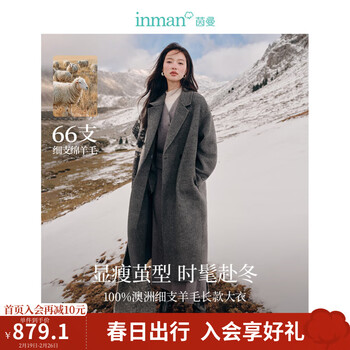 旗舰店茵曼100%绵羊毛双面呢外套2024冬女新款美拉德翻驳洋气长款大衣上衣 深花灰 M