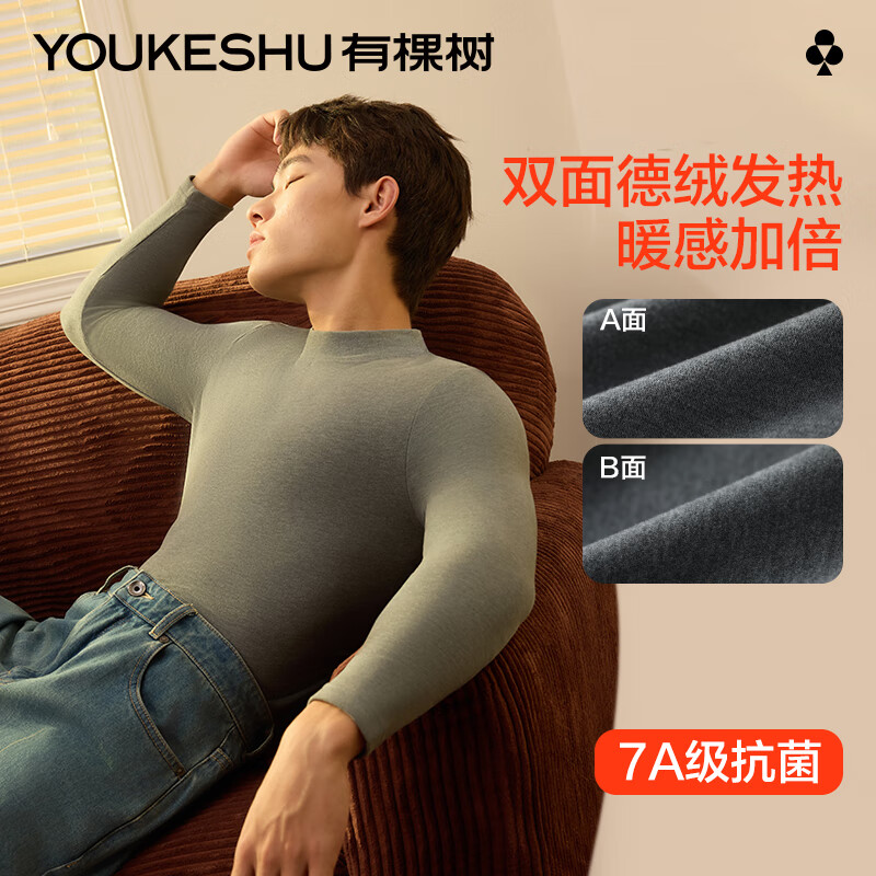 旗舰店有棵树保暖上衣男双面德绒锁温7A级抗菌圆领百搭打底衣秋冬秋衣男 浅灰 3XL