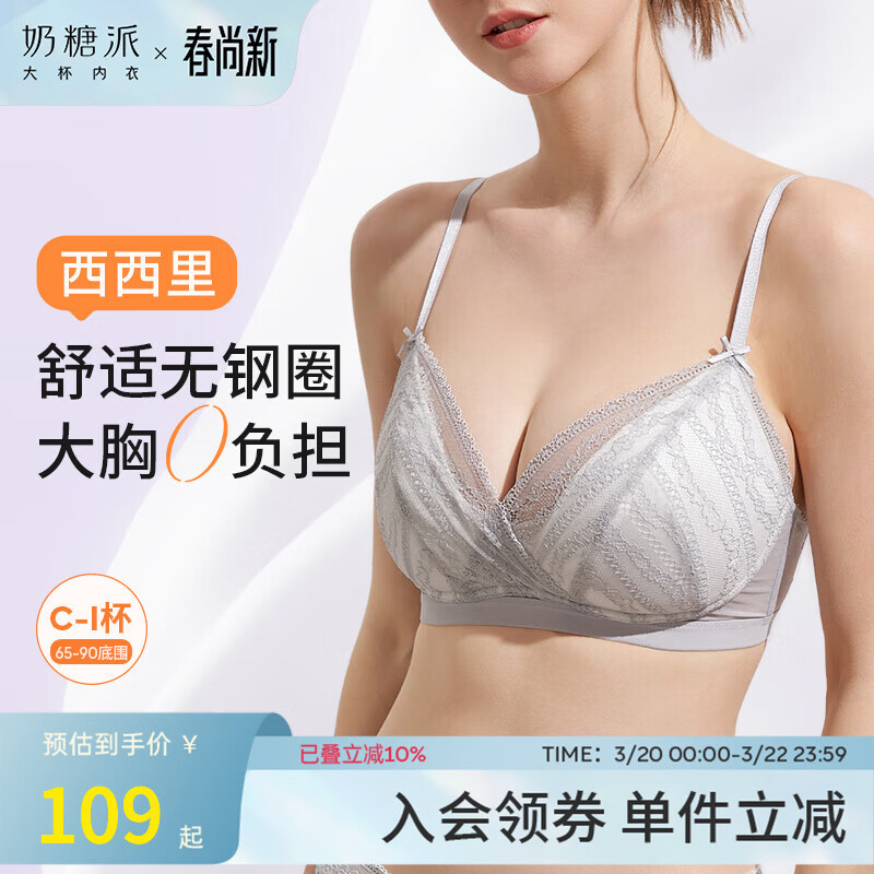 旗舰店奶糖派大胸文胸西西里法式三角杯薄款内衣大胸显小无钢圈防凸点送女友 月岩灰 M 1【75B-C,80A-B】