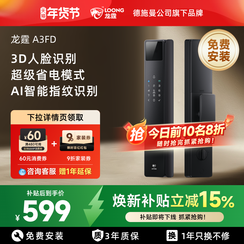 旗舰店【限时直降】德施曼旗下龙霆A3FD智能门锁人脸指纹家用远程密码锁
