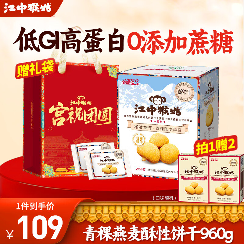 旗舰店江中猴姑酥性饼干养胃猴头菇高钙早餐代餐零食年货礼盒送长辈送礼糖友可吃 青稞粗粮丨低GI饼干960g