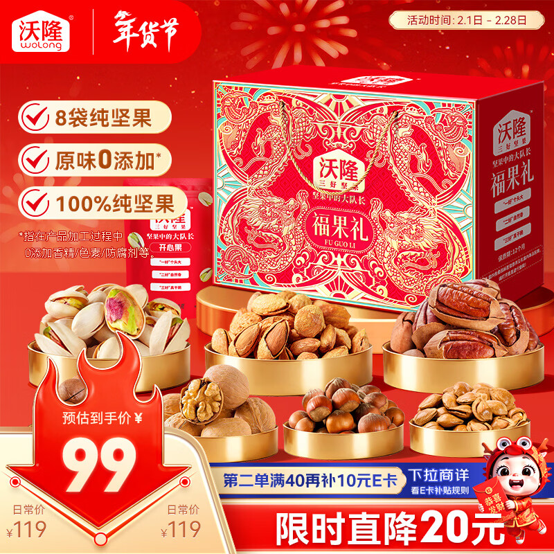 自营沃隆纯坚果礼盒8袋1220g福果礼零食干果炒货节日大礼包企业团购送礼品