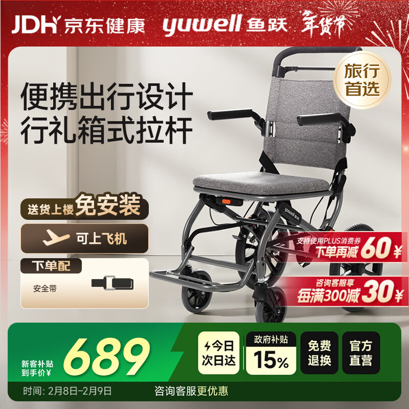 自营鱼跃(yuwell)手动轮椅车1100A折叠老人轻便便携式手推车旅行可上飞机