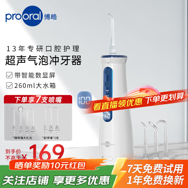 旗舰店博皓(prooral)冲牙器便携式牙齿冲洗器洗牙器超声波气泡水牙线正畸专用洁牙器牙垢清洁去除器 生日礼物 5025Pro 瓷白|7支喷嘴|260ml水箱|智能数显